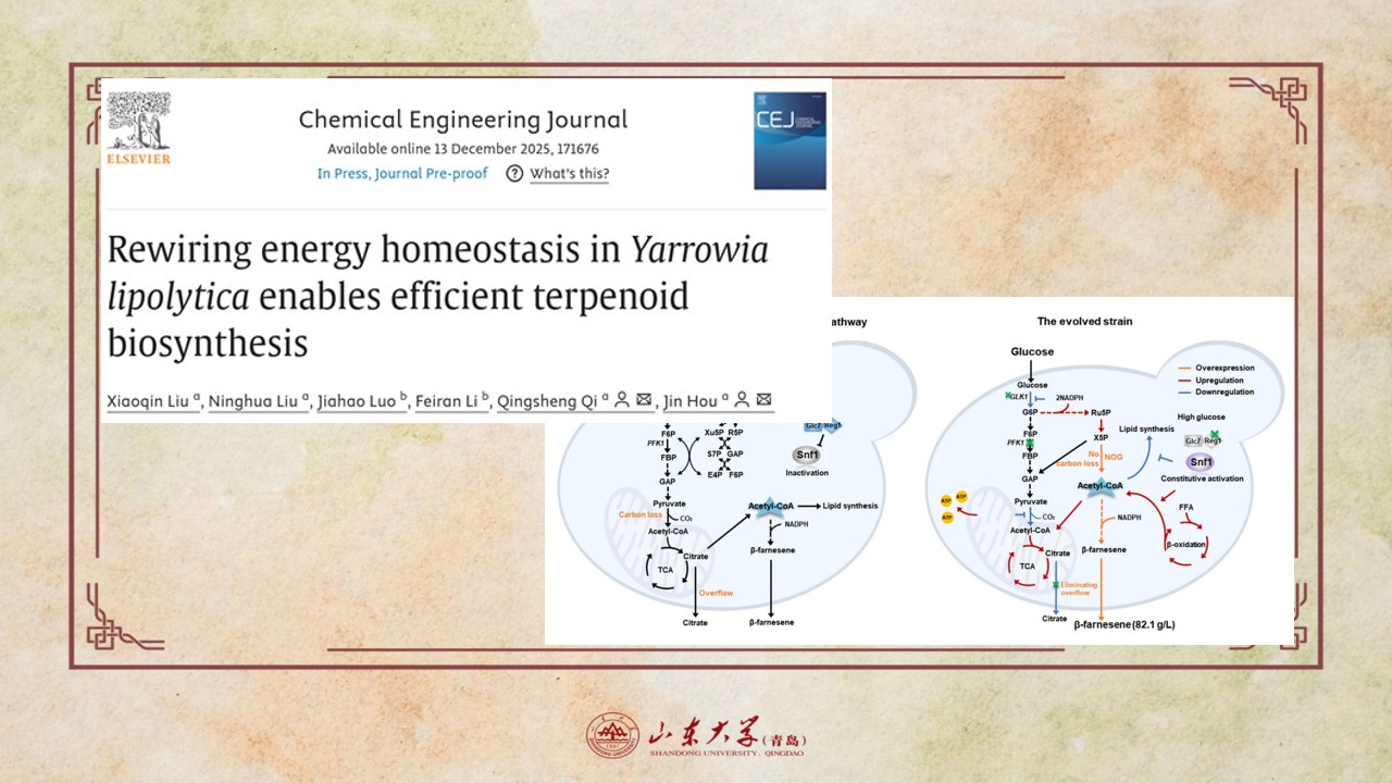 近日,山东大学微生物改造技术全国重点实验室祁庆生/侯进团队在ChemicalEngineeringJournal期刊上发表了题为“RewiringenergyhomeostasisinYarrowialipolyticaenablesefficientterpenoidbiosynthesis”的研究成果。该研究通过全局代谢重塑,将碳流从“代谢溢流”转向高效合成β-法尼烯,最终实现82.1g/L的产量,创下解脂...