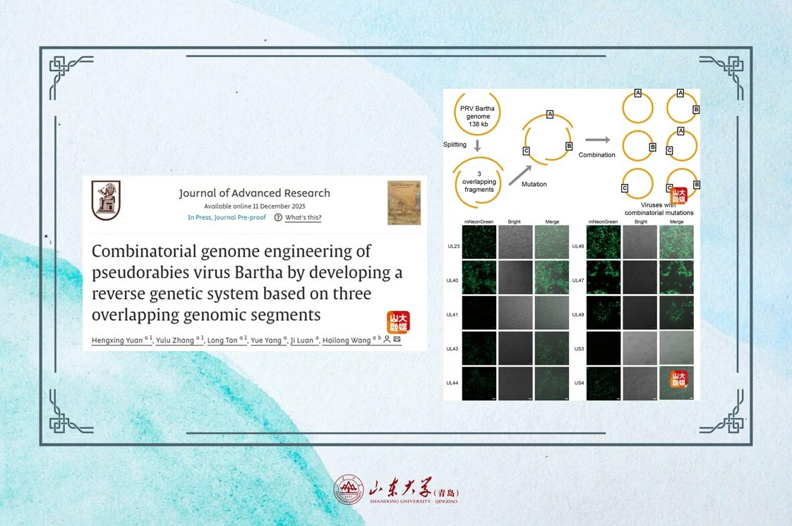 12月11日,JournalofAdvancedResearch 期刊在线发表了山东大学微生物改造技术全国重点实验室王海龙教授课题组的研究论文“CombinatorialgenomeengineeringofpseudorabiesvirusBarthabydevelopingareversegeneticsystembasedonthreeoverlappinggenomicsegments”。王海龙教授为论文通讯作者,博士后袁恒星、博士生张...