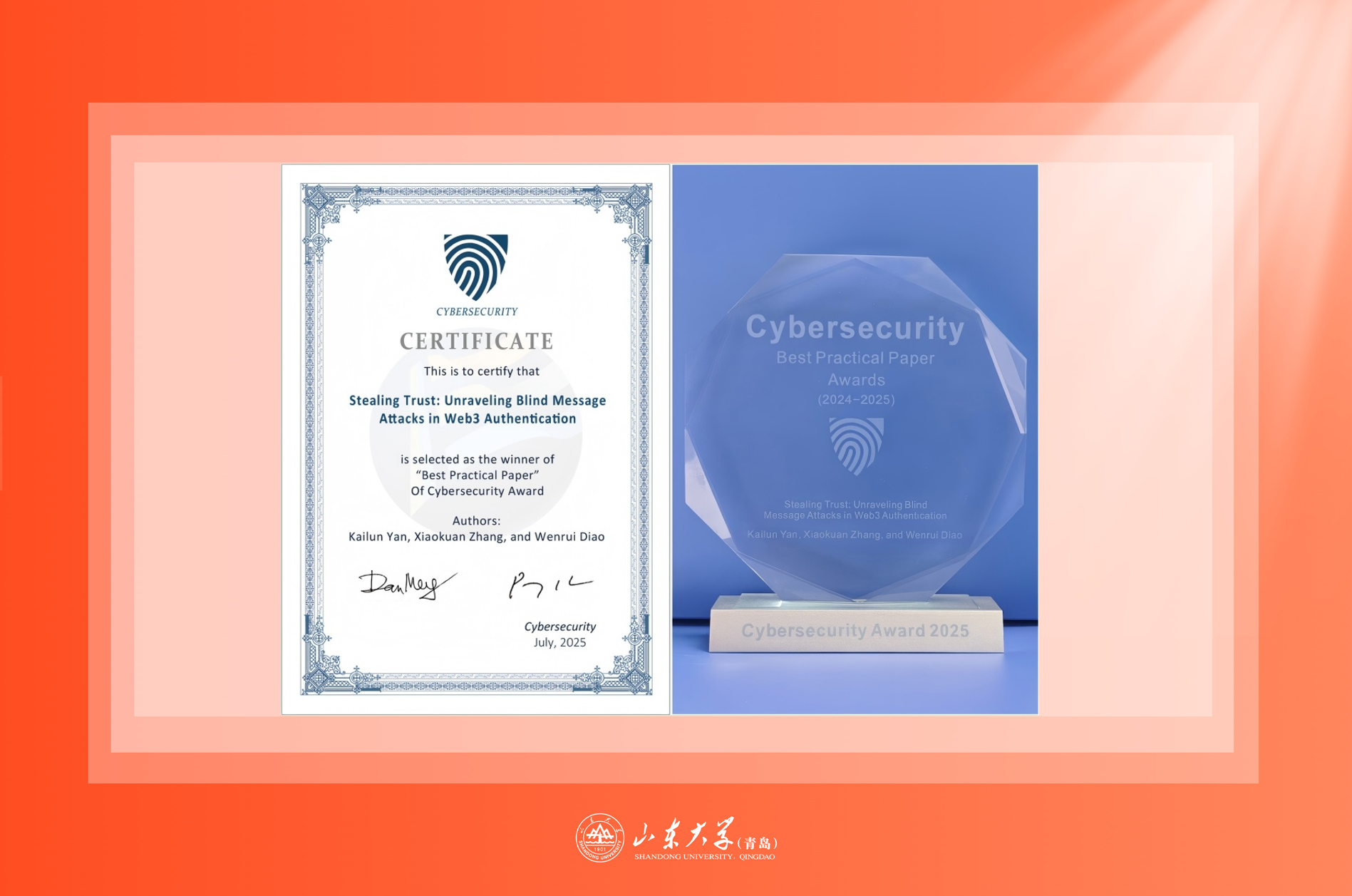 近日,网络空间安全学院刁文瑞教授团队的论文荣获CybersecurityAward2025-BestPracticalPaper(最佳实践论文奖)。该奖项由Cybersecurity 期刊颁发,旨在表彰在网络空间安全领域做出杰出和突破性贡献的研究成果。获奖论文题为“StealingTrust:UnravelingBlindMessageAttacksinWeb3Authentication”,发表于计算机安...