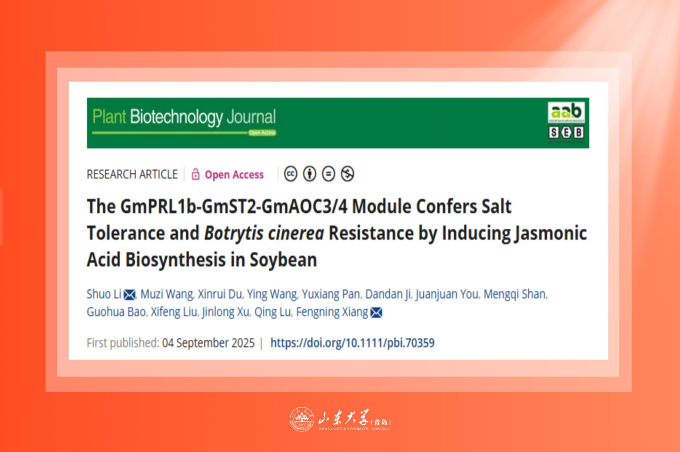 9月4日,山东大学生命科学学院向凤宁/李朔团队在PlantBiotechnologyJournal杂志在线发表了题为“TheGmPRL1b-GmST2-GmAOC3/4moduleconferssalttoleranceandBotrytiscinerearesistancebyinducingjasmonicacidbiosynthesisinsoybean”的最新研究成果。揭示了GmPRL1b-GmST2-GmAOC3/4模块介导茉莉酸(JA)通路精准调控生长与...