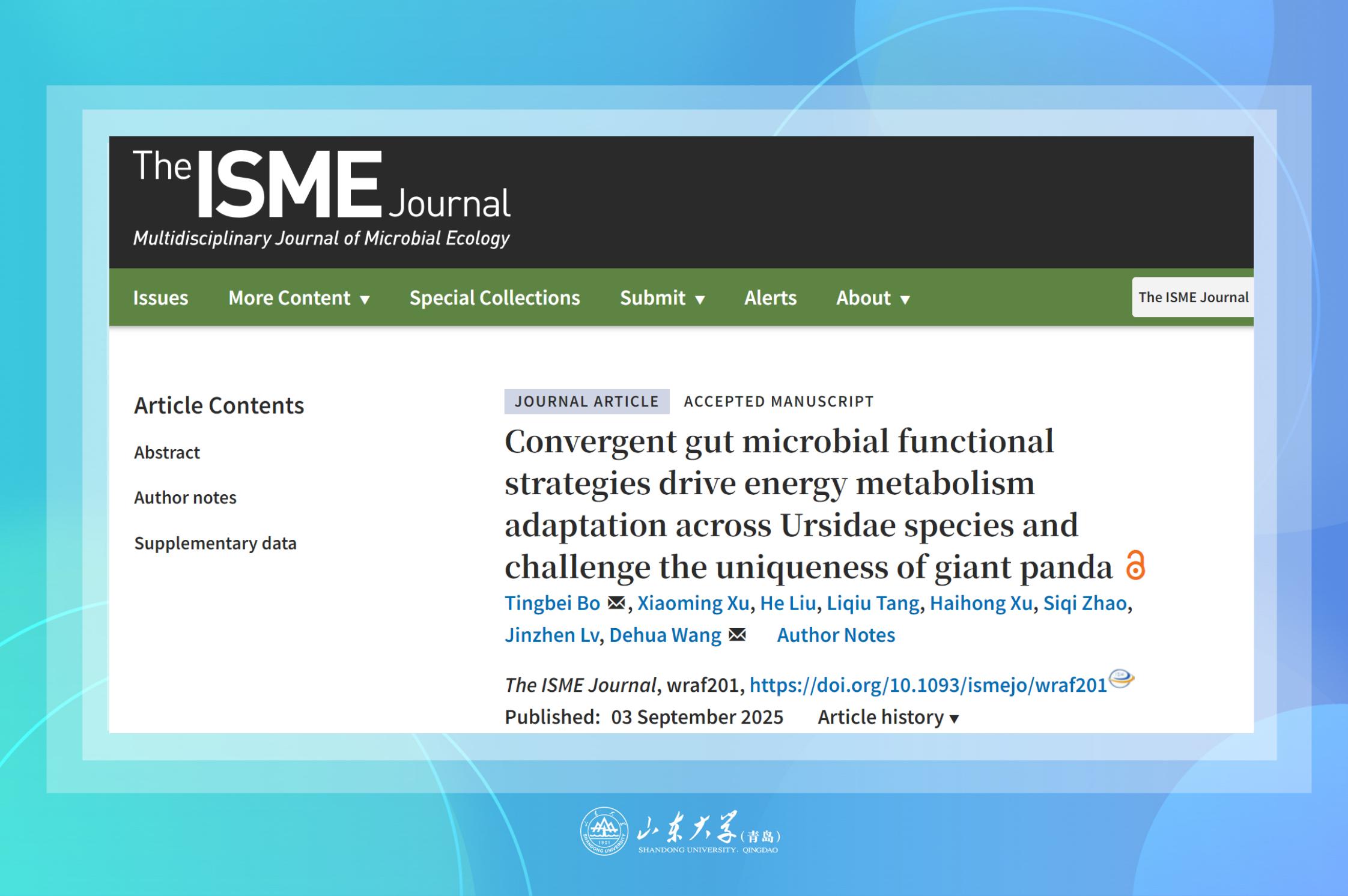 9月3日,山东大学生命科学学院王德华教授团队与北京林业大学、北京动物园合作的一项关于熊科动物肠道微生物与能量代谢适应机制的研究成果以“ConvergentgutmicrobialfunctionalstrategiesdriveenergymetabolismadaptationacrossUrsidaespeciesandchallengetheuniquenessofgiantpanda”为题在线发表在TheISMEjournal上。...