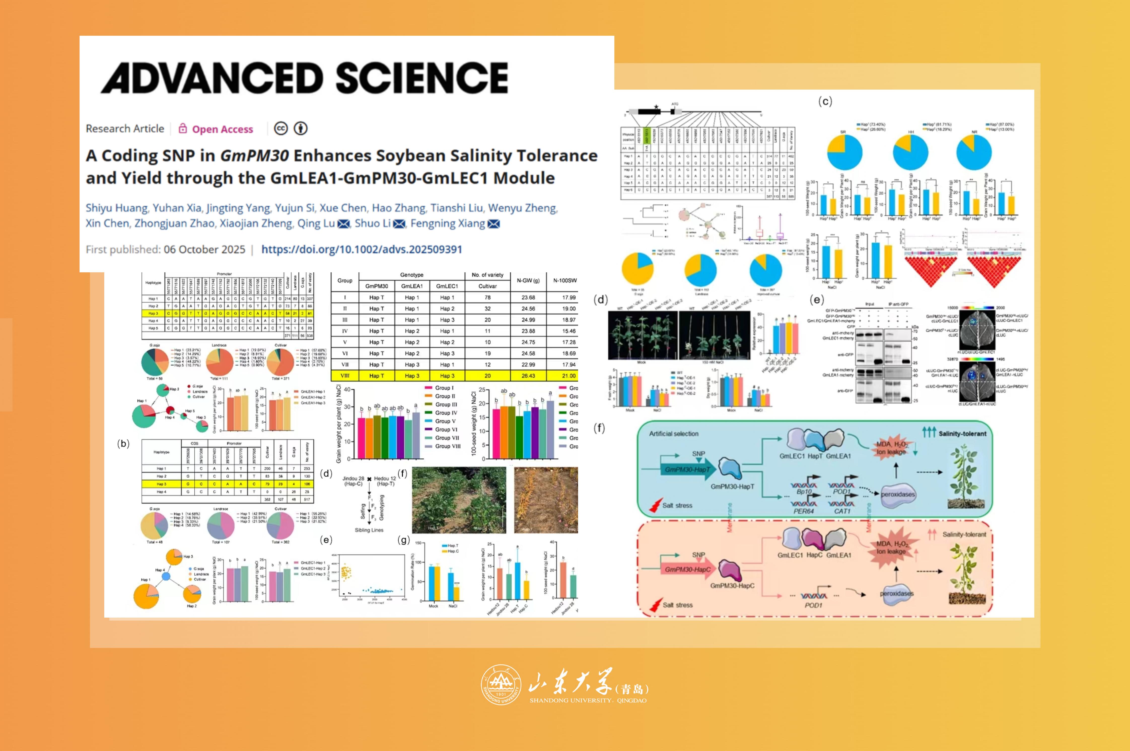 10月6日,山东大学生命科学学院向凤宁教授团队在AdvancedScience 杂志发表题为“ACodingSNPinGmPM30EnhancesSoybeanSalinityToleranceandYieldthroughtheGmLEA1-GmPM30-GmLEC1Module”的研究论文。研究揭示了耐盐基因GmPM30编码区一个单碱基变异提高大豆产量及耐盐碱性的新机制。在读博士研究生黄仕钰为该论文第一...