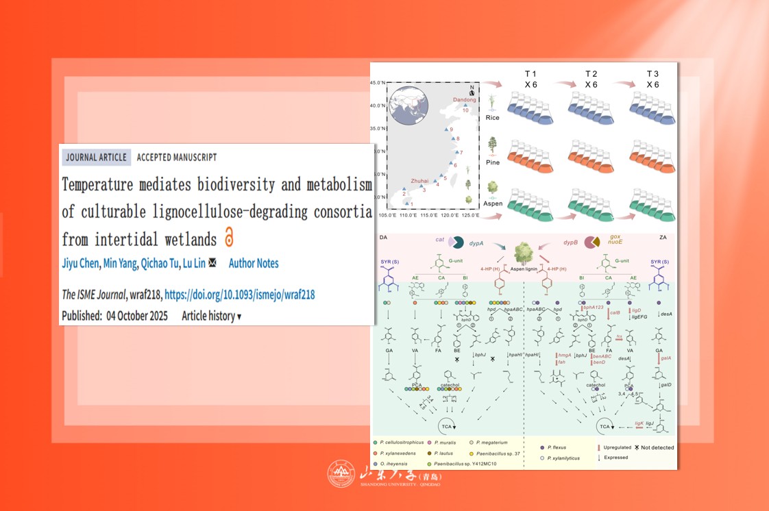 近日,山东大学海洋研究院林璐教授团队在木质纤维素降解菌群生态代谢机制方面取得新进展,相关成果以“Temperaturemediatesbiodiversityandmetabolismofculturablelignocellulose-degradingconsortiafromintertidalwetlands”为题在TheISMEJournal杂志上发表,山东大学博士研究生陈济宇和硕士研究生杨敏为共同第一作者,...