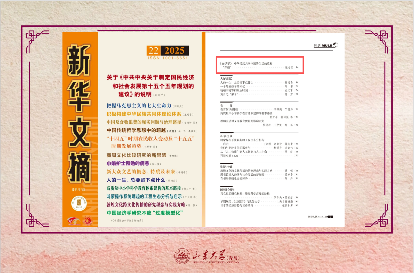 人文艺术研究院荣聘教授张志忠的文章《<在伊犁>:中华民族共同体缤纷生活的重彩“深描”》被《新华文摘》2025年第22期全文转载。文章原发于《文艺争鸣》(CSSCI)2025年第7期,本文聚焦荣获“人民艺术家”称号的著名作家王蒙以其在新疆伊犁地区六年生活体验创作的《在伊犁》小说集(2024年秋再度出版)。借助人类...