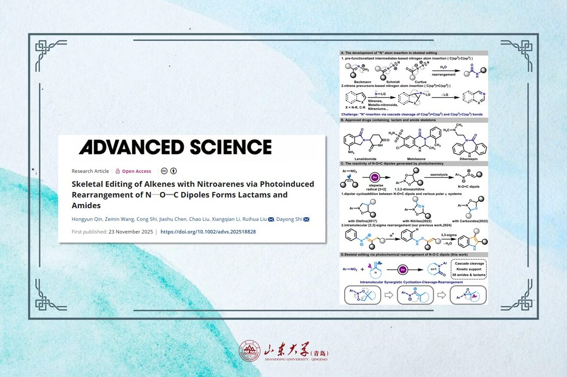 近日,山东大学微生物改造技术全国重点实验室史大永教授团队在Advanced Science上发表题为“Skeletal Editing of Alkenes with Nitroarenes via Photoinduced Rearrangement of N–O=C Dipoles Forms Lactams and Amides”的研究论文...